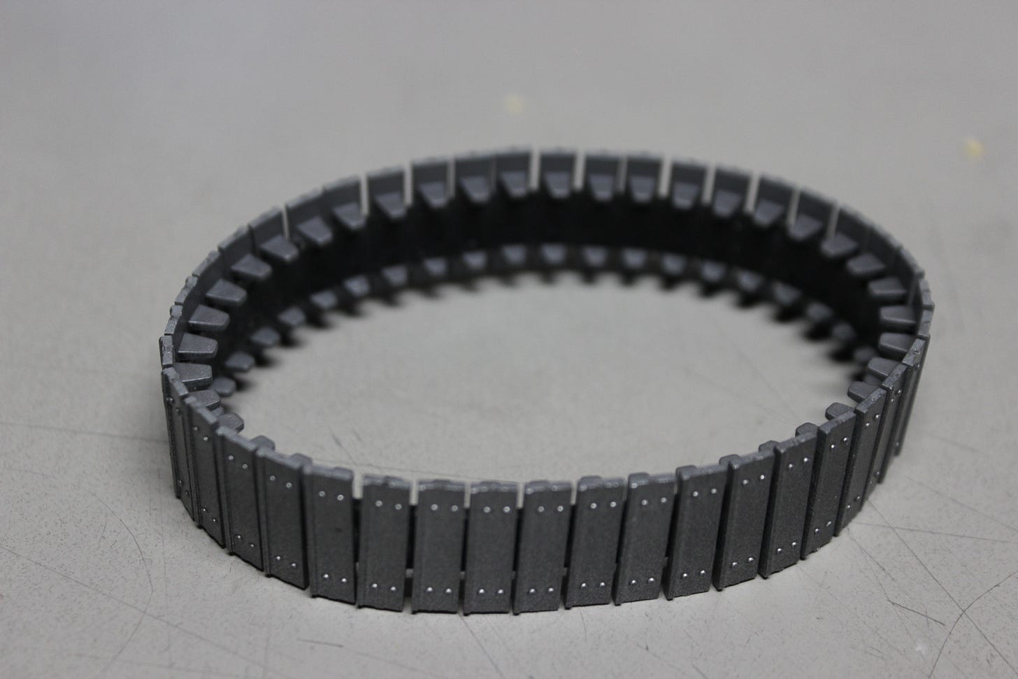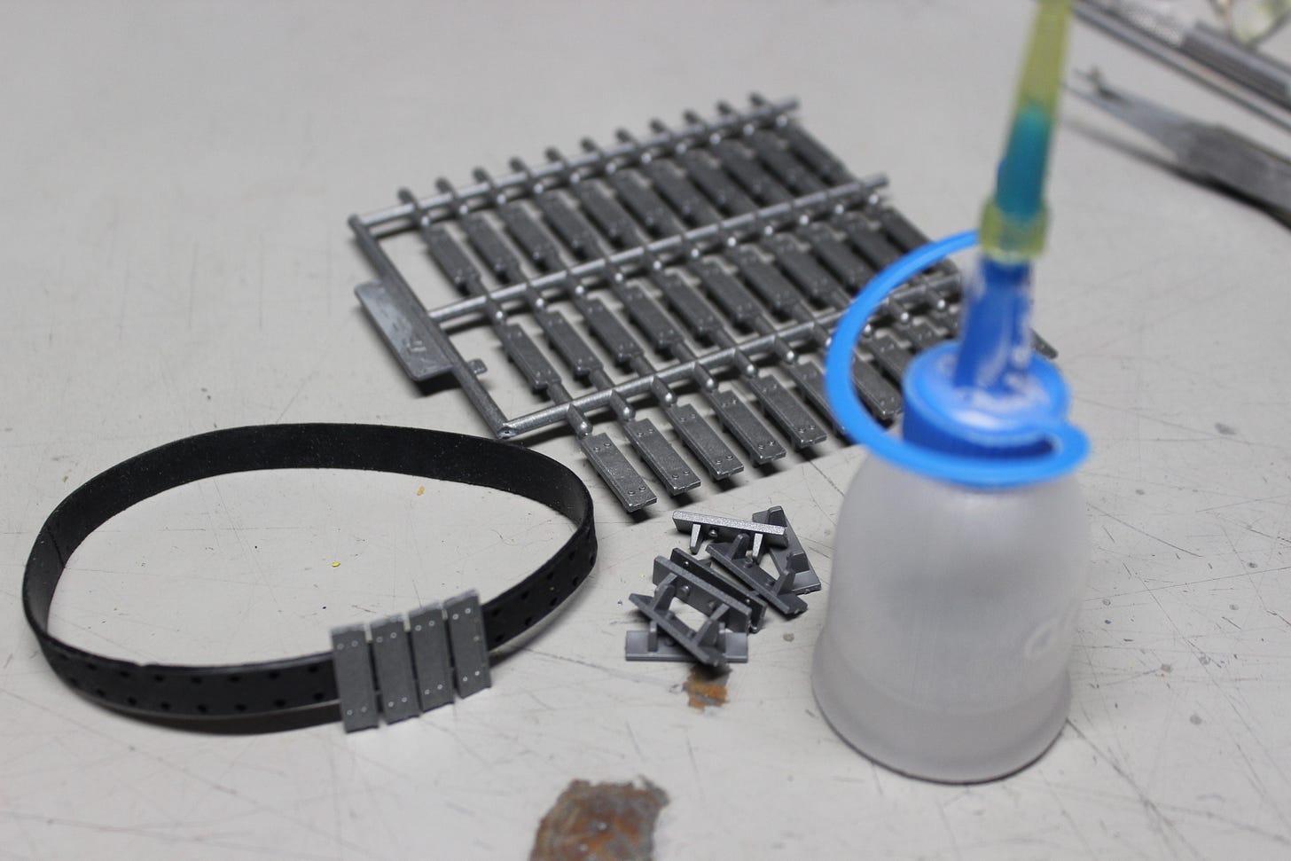 The tracks on the main carriage vehicle on the kit was essentially a rubber band that you had to glue the track plates to using Cyanoacrylate (superglue). This worked remarkably well as per the destructions.