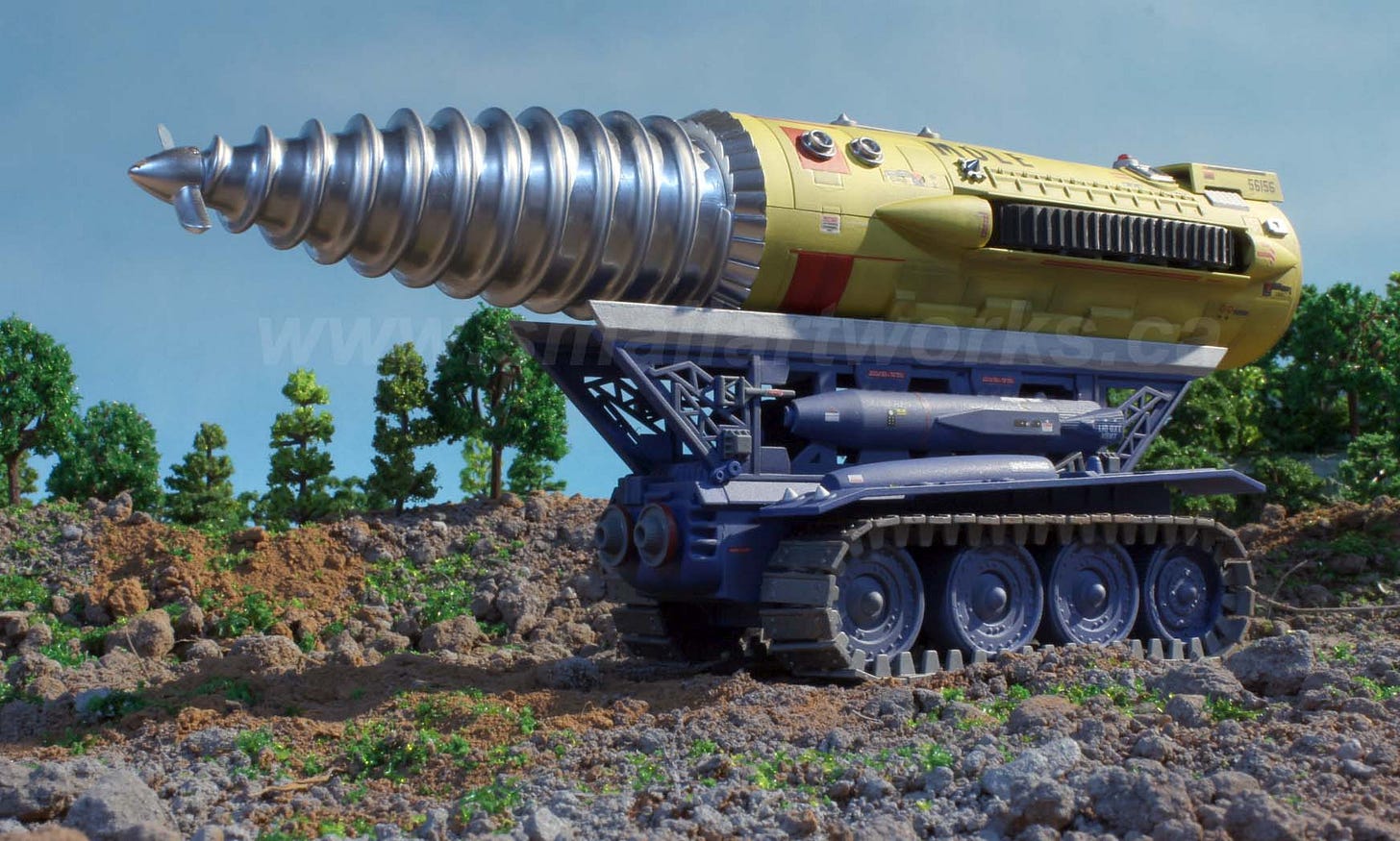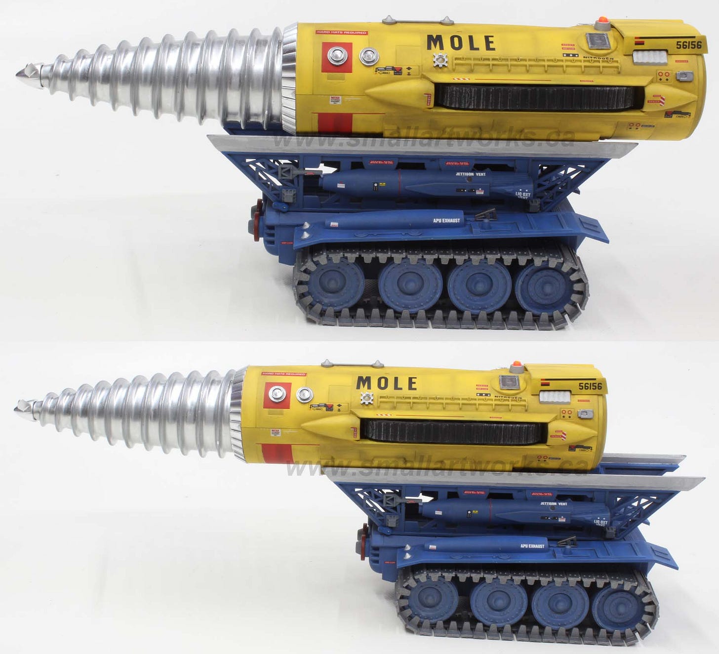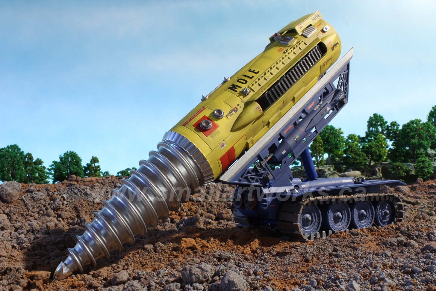 Another Thunderbirds model built for my buddy Dan. This is from yet another AIP/Aoshima kit and somewhat modified. I had a lot of fun building this one too, as it’s so different from what I usually build. The finished model is a mere 10 inches shlong... I mean LONG (OK, stop with the obvious jokes you’re gonna burrow into now… and how can they be avoided noting the shape of this thing!) but surprisingly articulated, and with the slight modifications I made to it, even more so. This kit as sold originally by Aoshima apparently came with several motorized features (Hey! I said stop with the obvious jokes!), but AIP sold the kit without those benefits (!!) so they could, I guess, make more profit by excluding them and simply selling it as a static model at an inflated price. But the remnants of the motorized version made it easier for me to make the mods that made it a little better as a display model with a few manual features, such as the flashing red light on top (maybe not “canon” but it looked like something that should have been) and a “sled” that allowed the Mole section to be positioned anywhere along its launch track as well as being easily removable by using magnets instead of the rather difficult and fragile clip-on tabs that were supposed to be used.