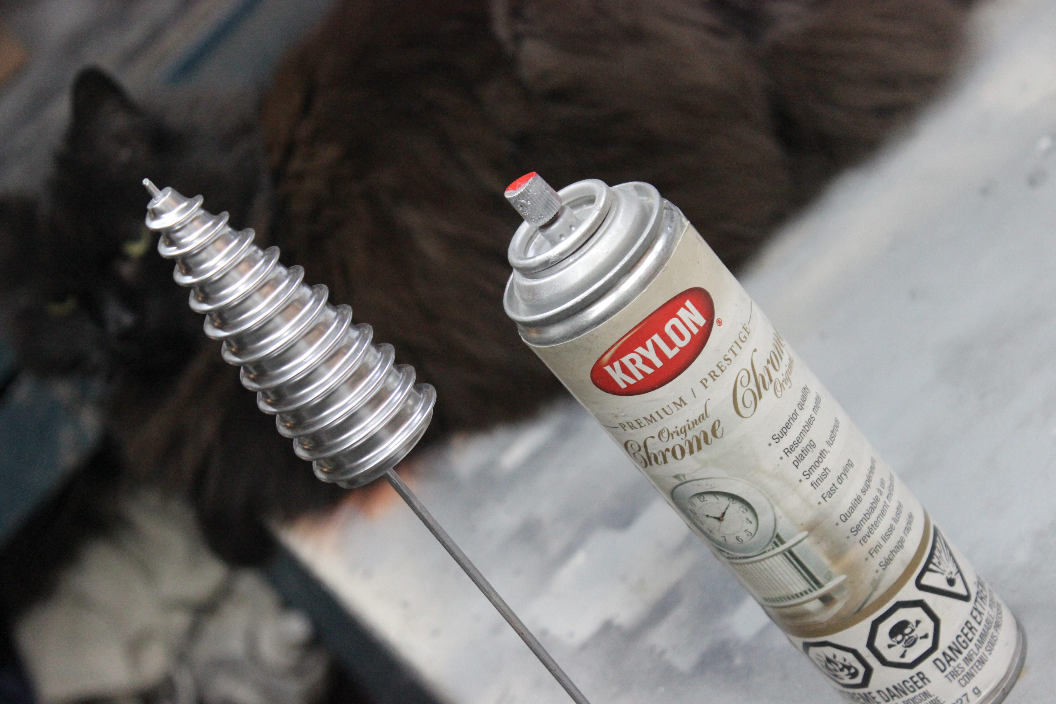 And once smooth, the whole section was primed and then sprayed with a “chrome” paint. These supposed “chrome” paints are outright lies by the manufacturer, as they do NOT approach “chrome plating” as advertised (despite the fact that the can had a cap that was indeed vacuum metalized chrome plated) at all and are nevertheless a bright silver, but they will NOT withstand ANY handling whatsoever, even when dry, so a suitable protection coat was needed. After spraying and drying overnight, a coating of “Future” floor polish (or equivalent) results in a finish that is VERY close to the way the original kit plating looked, and the seams are gone. Houdini, my last surviving cat (as I lost my tuxedo cat Zander a couple of months ago… sadly he died after fifteen years of friendship), lurks in the shadows behind the silvery bits in this shot below.