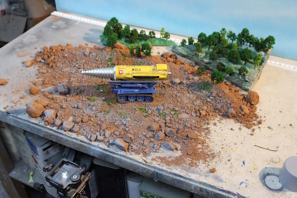 The tracks remained workable and supple so they would actually move as per the original studio model. (BTW the original studio models for most Thunderbird tracked vehicles such as this Mole and the Firefly, the recovery vehicle and others used a kid’s toy called the Vickers Vigor, about a foot long, available at the time for the chassis which was a tractor/bulldozer type model.)