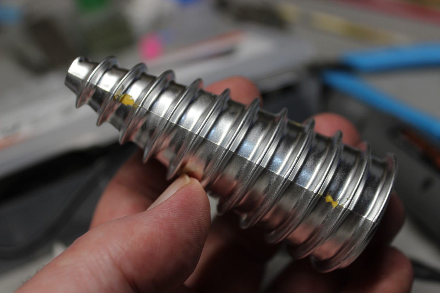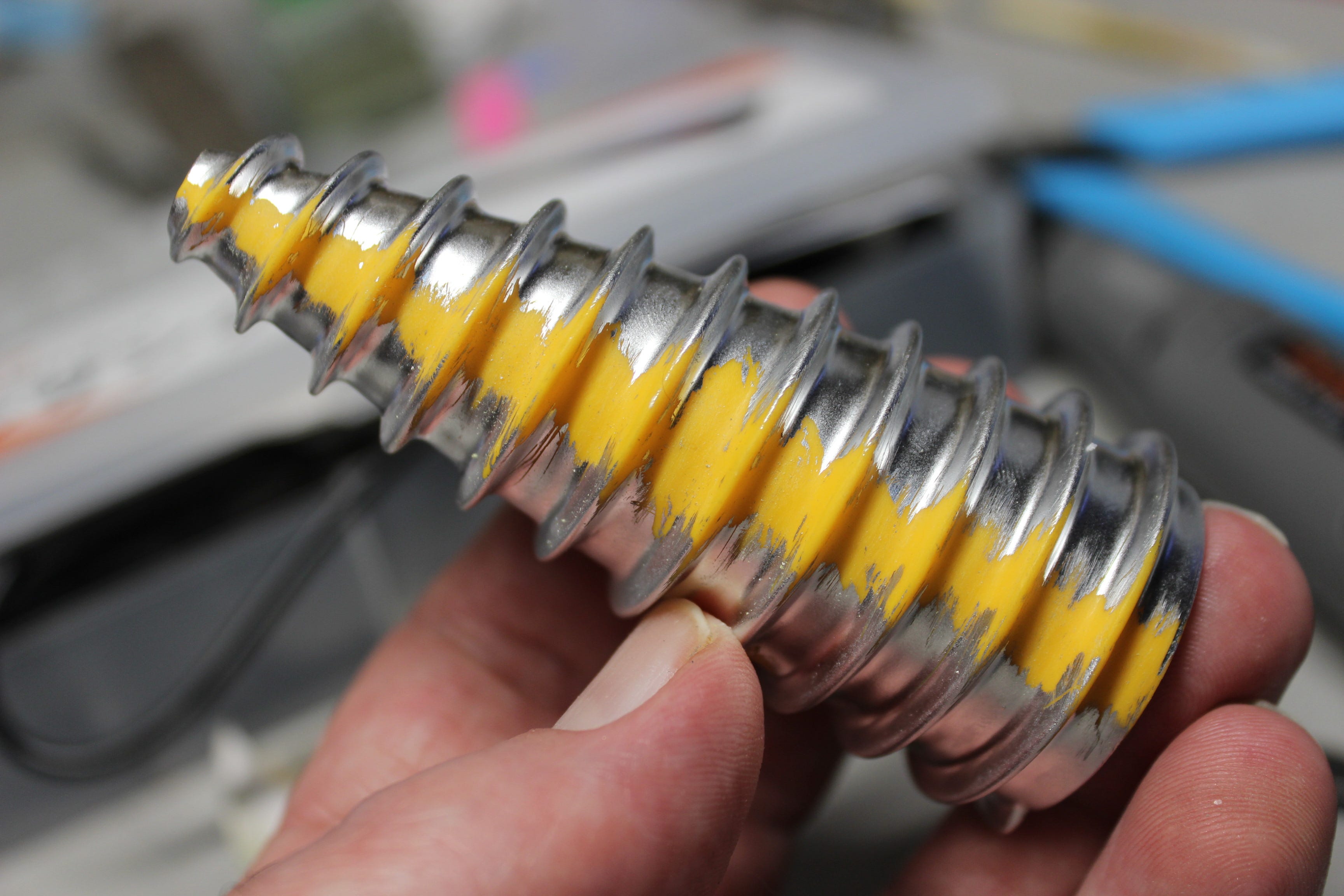 I didn’t photograph everything I did with this model but one disappointing thing is that I had to destroy the beautiful matte silvery plating on the “screw” (Ugh.. more jokes abound) in order to hide the molding seam, as shown here: