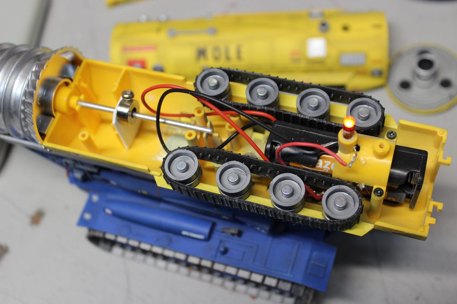 Here is the interior assembly of the Mole itself, showing the battery pack to run the red flashing light on top, the side tracks assembly and the modifications made to the drill section modified with an aluminum rod affixed with a collar and set screw so that it would turn and not flop around or come loose.