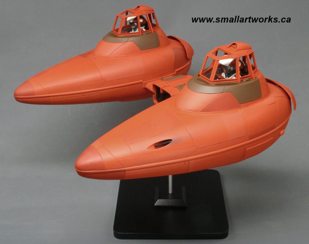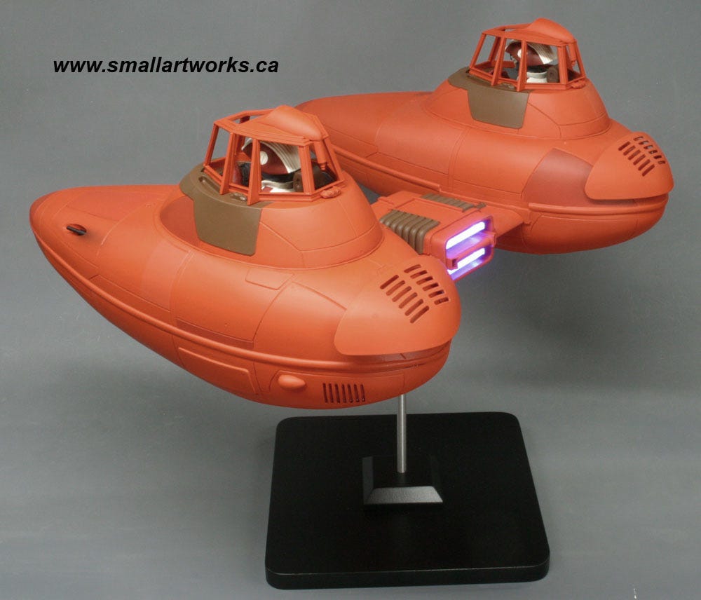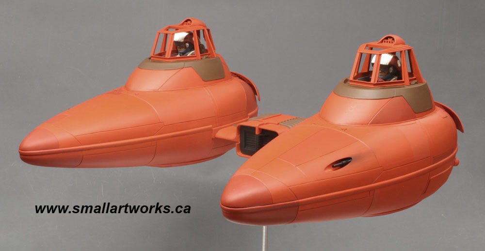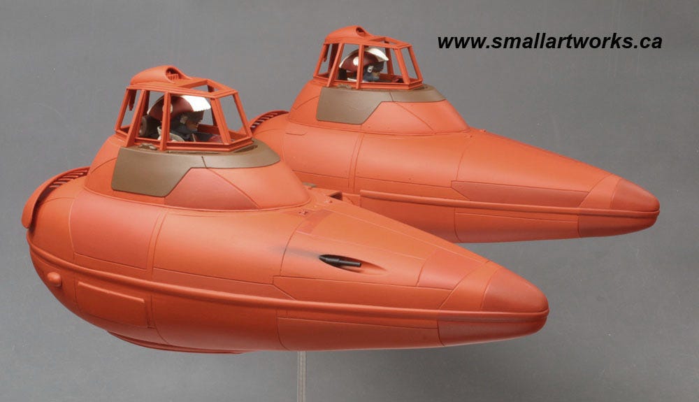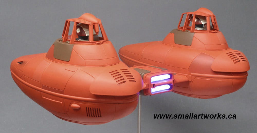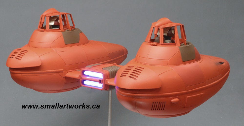 Back around 2010 I was asked to build a resin “garage kit” model of the Twin Pod Cloud Car from The Empire Strikes Back. I wanted one too, so I made a deal with the client whereby I could get one for myself as well. They were reportedly studio scale (same size as the actual filming miniatures). I built them both at the same time, assembly-line style so both models were identical. I made stands with wooden bases and aluminum rods for support.