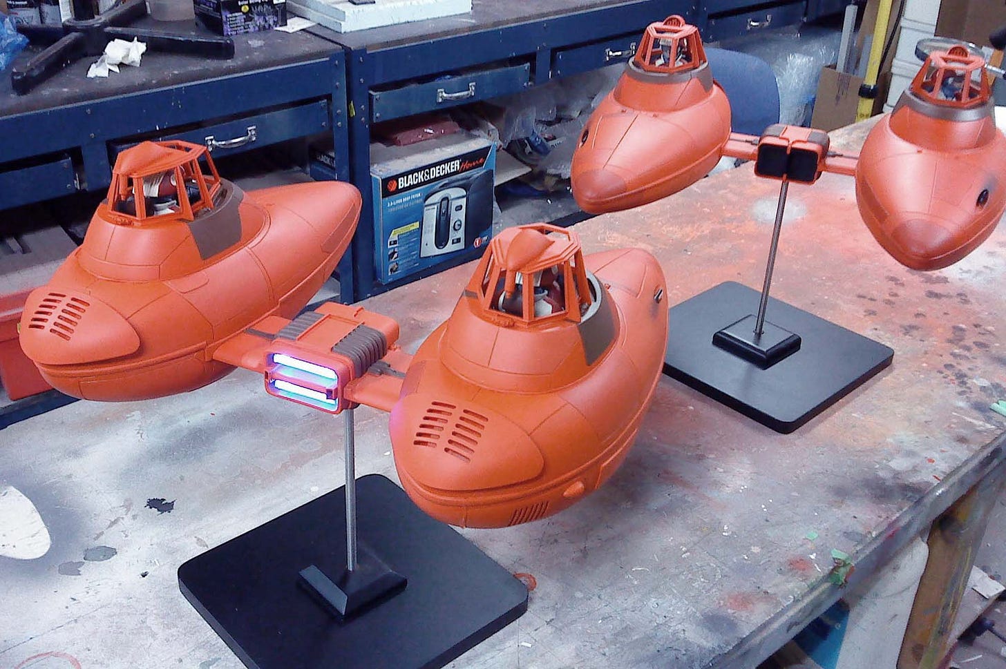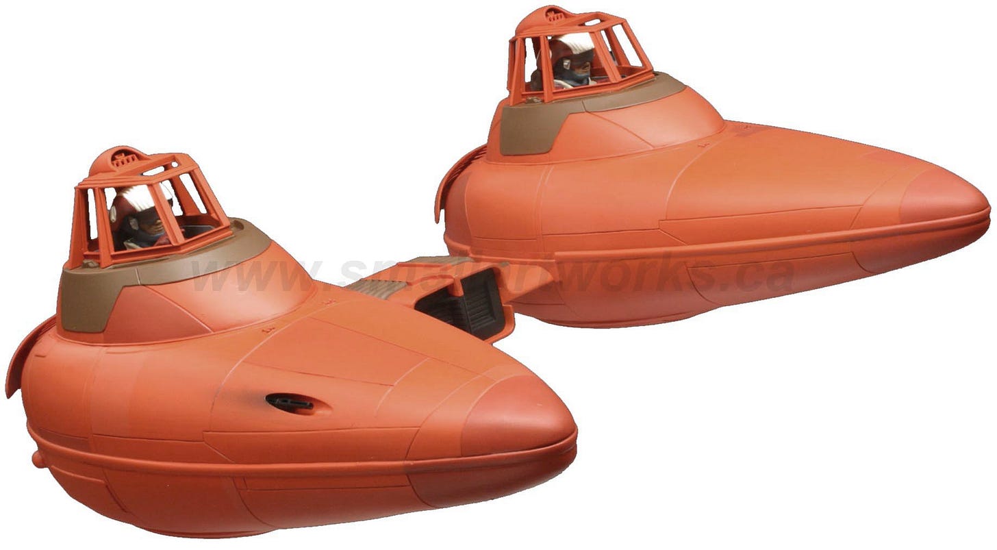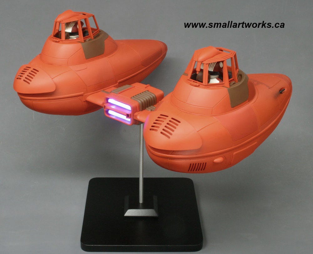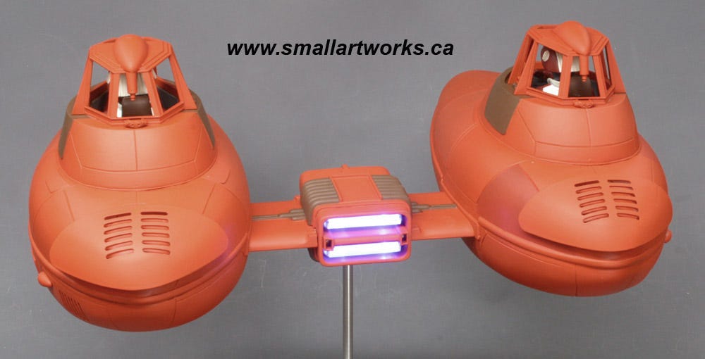 Back around 2010 I was asked to build a resin “garage kit” model of the Twin Pod Cloud Car from The Empire Strikes Back. I wanted one too, so I made a deal with the client whereby I could get one for myself as well. They were reportedly studio scale (same size as the actual filming miniatures). I built them both at the same time, assembly-line style so both models were identical. I made stands with wooden bases and aluminum rods for support.