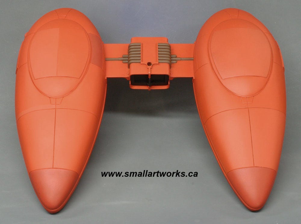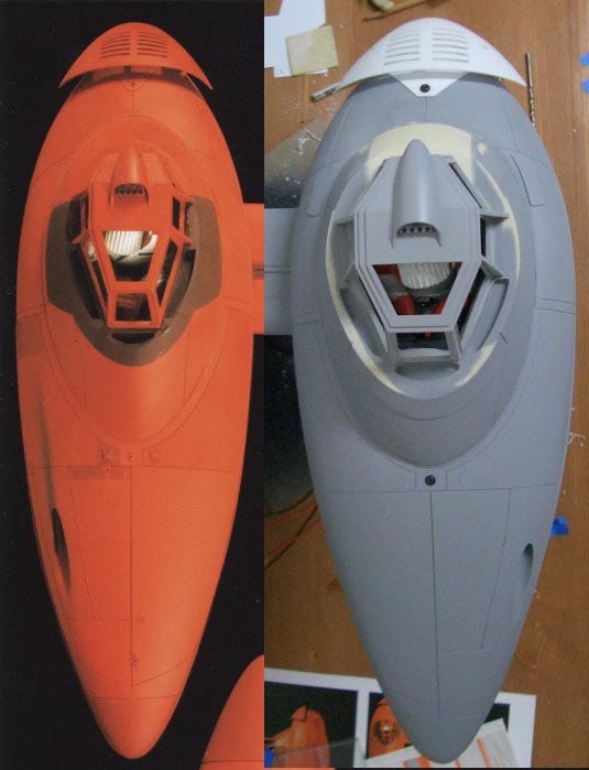 After I had built the models, and frankly as I was building them, I noticed a big problem with their accuracy. The twin pods had been mastered by the kit maker to be far too fat when compared to the filming miniature which was considerably more slender. This is shown in the comparison photo below. The studio miniature is on the left. My unfinished buildup on the right.