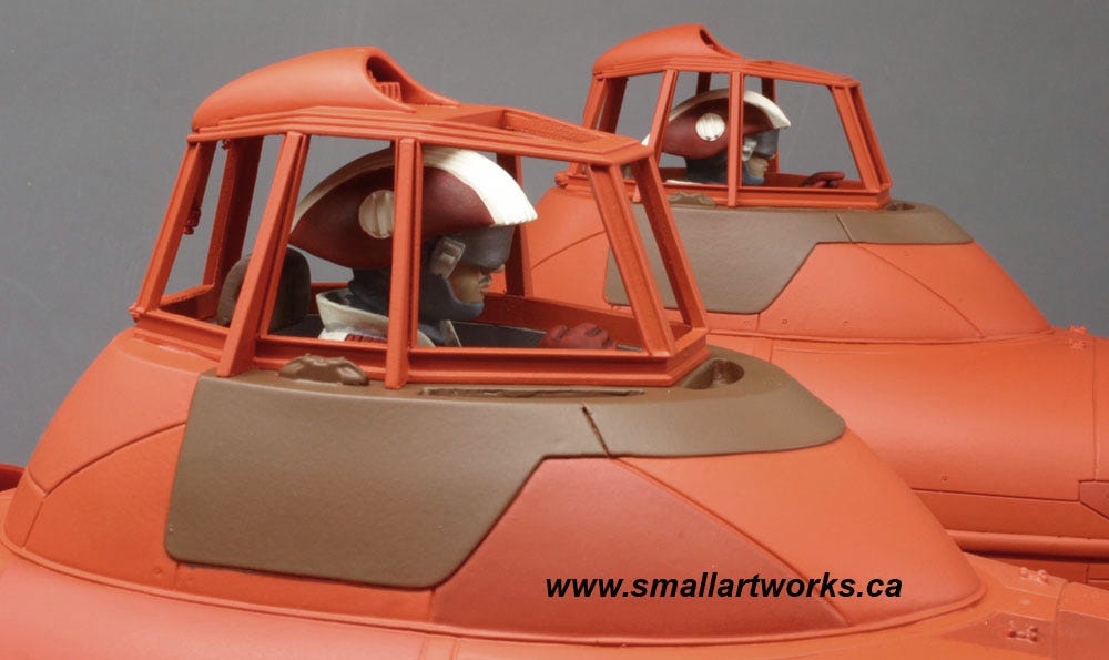 The models were not weathered as neither were the studio miniatures, just some slight panel colour variations and light streaks suggesting blow-back from the nose mounted blasters. I tried to replicate the paint work of originals as closely as possible.